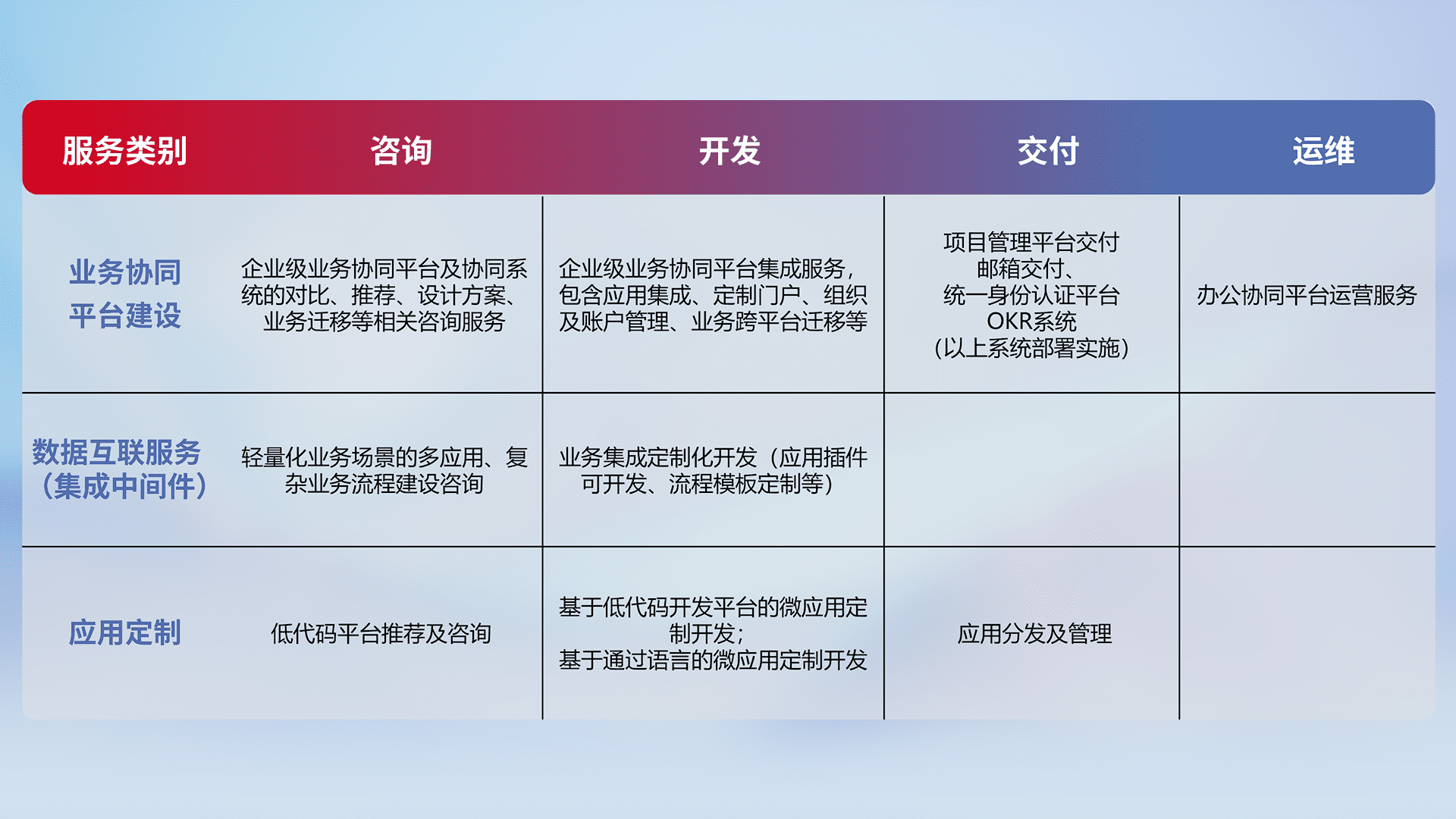 针对钉钉、、、企微、、IDaas等平台级产品提供产品的规划、、、方案、、交付、、、、定制化开发等服务,,,,实现如统一协同办公、、、、智能客户服务、、混合会议管理、、智能数据查询、、等业务场景,,,,实现数字化转型。。。。